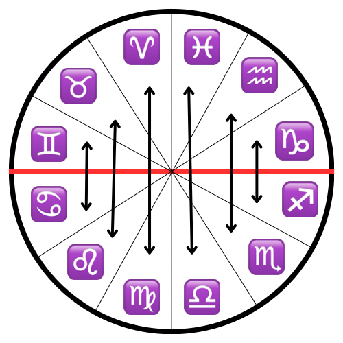 アンティシアとは、夏至から冬至までを軸としてホロスコープを折りたたんだ際に、重なるサイン同士の日照時間が同じくなるポイントのことを言います。