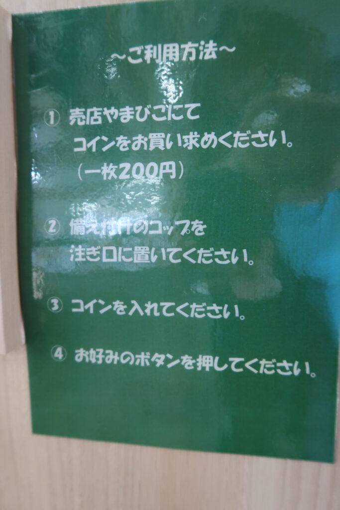 自販機近く(自販機の真向かいに立って右側)のお弁当などを売っているコーナーの売子さんに声をかけ、コインを200円で購入し、それを自販機に投入して試飲するスタイルだそうです(使い方こちら↓です)。