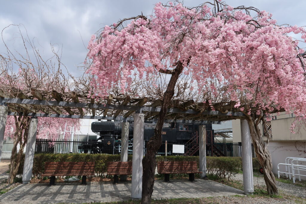 到着してみると、駅にはいい感じの色の濃い桜が。SLも展示されていたので、一緒に撮影してみました。