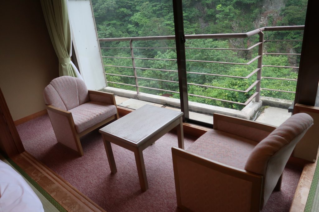 部屋の奥は全面窓になっていて、広縁にテーブルと椅子が備えつけてある。
